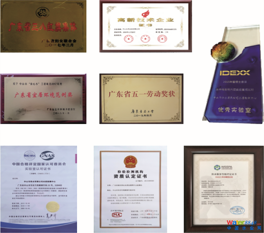 供水服務(wù)發(fā)展聯(lián)盟4星級(jí)企業(yè)、最具社會(huì)責(zé)任水務(wù)企業(yè)、廣東省省級(jí)先進(jìn)企業(yè)、廣東省誠(chéng)信示范企業(yè)、廣東省巾幗文明崗、廣東省/ 中山市三八紅旗集體、廣東省五一勞動(dòng)獎(jiǎng)狀、廣東省宜居環(huán)境范例獎(jiǎng)、中山市最受市民歡迎的公共服務(wù)窗口、中山市高新技術(shù)企業(yè)