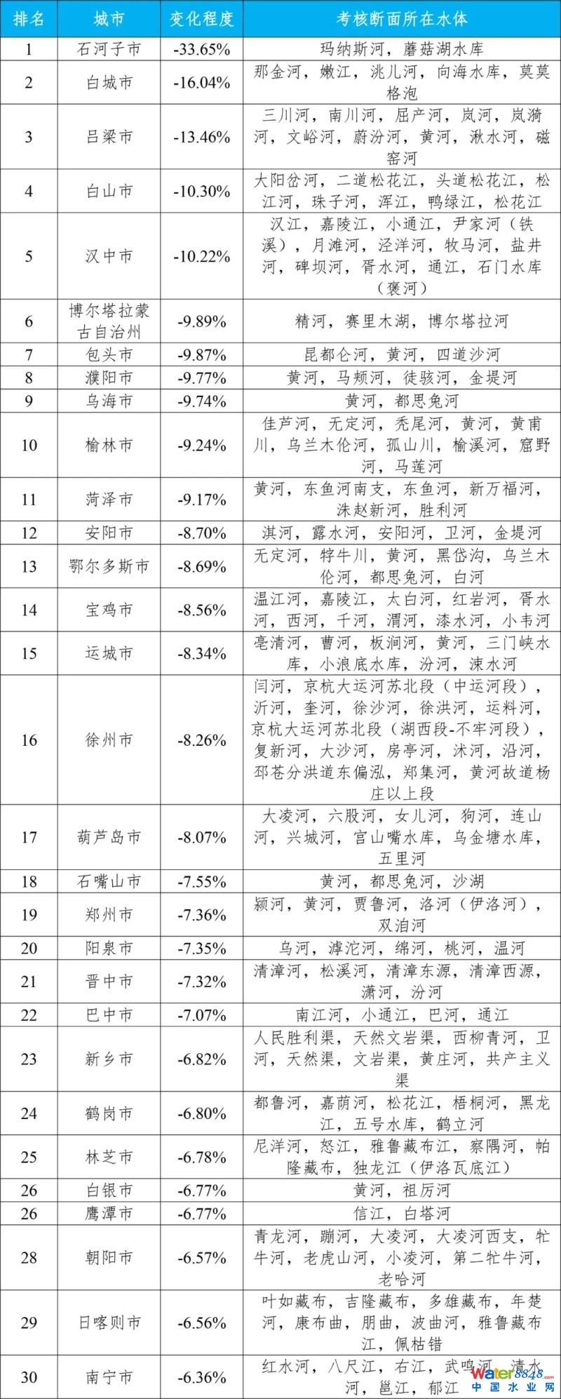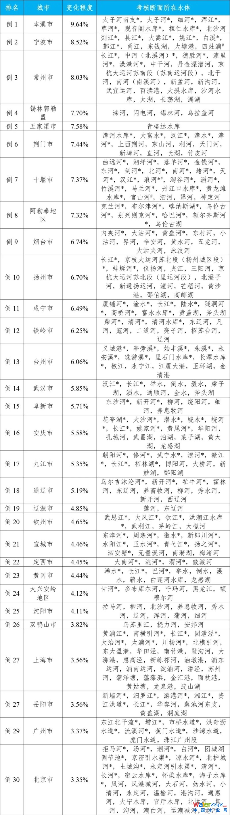 石河子市、白城市和呂梁市等30個城市國家地表水考核斷面水環(huán)境質(zhì)量變化情況相對較好(從第1名至第30名),本溪市、寧波市和常州市等30個城市國家地表水考核斷面水環(huán)境質(zhì)量變化情況相對較差(從倒數(shù)第1名至倒數(shù)第30名)。見附表3—4。