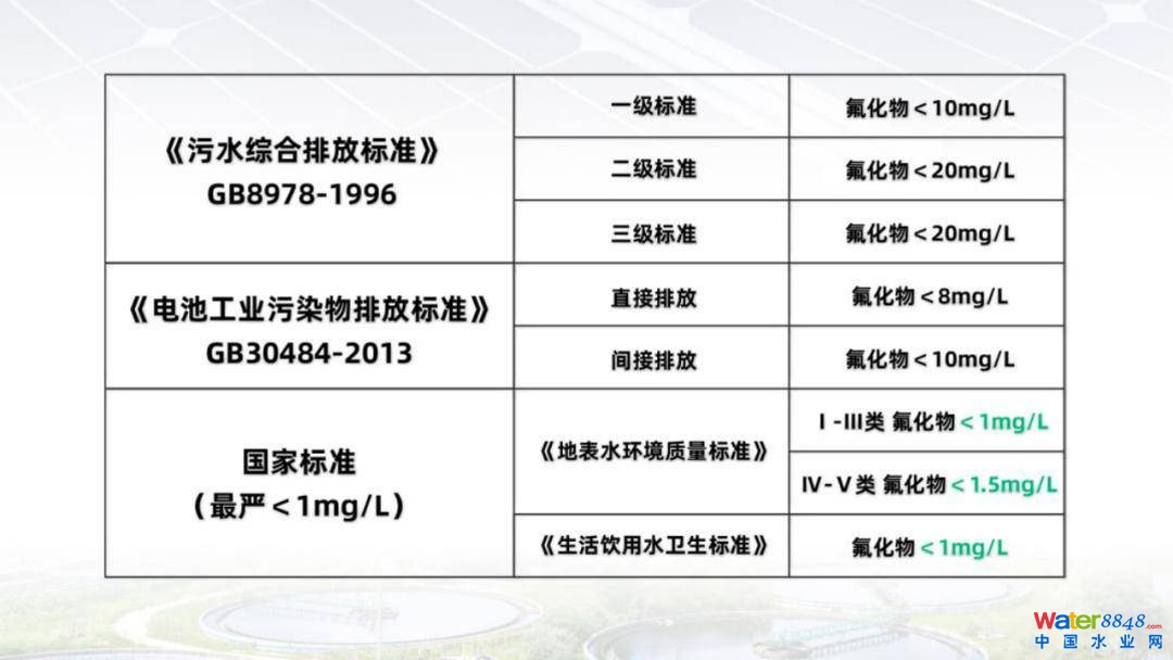 近年來,從國家到各地方也相繼出臺(tái)了一系列工業(yè)廢水重點(diǎn)污染物排放總量控制指標(biāo)政策,水體氟化物治理標(biāo)準(zhǔn)和要求不斷提升,有些區(qū)域甚至以《地表水環(huán)境質(zhì)量標(biāo)準(zhǔn)》三類限值作為排放標(biāo)準(zhǔn)來執(zhí)行;《江蘇城鎮(zhèn)污水處理污染物排放標(biāo)準(zhǔn)》更是要求自2023年3月28日起,氟化物排放限值降至1.5 mg/L,環(huán)保形勢(shì)日益嚴(yán)峻。