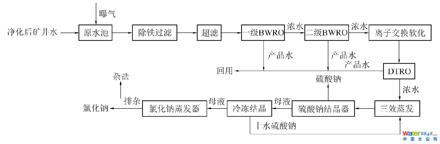 某礦應(yīng)地方環(huán)保部門要求,礦井水要實(shí)現(xiàn)零排放,處理后的產(chǎn)品水滿足飲用水要求。原水中TDS含量為2 505 mg/L,總體處理規(guī)模為600 m3/h,一期300 m3/h,預(yù)處理段工藝采用過濾除鐵、超濾及離子交換軟化工藝,濃縮段工藝采用BWRO+SWRO+DTRO工藝,蒸發(fā)結(jié)晶分鹽段采用三效蒸發(fā)工藝,工藝流程見圖1。最終產(chǎn)品水滿足《生活飲用水衛(wèi)生標(biāo)準(zhǔn)》(GB 5749—2006),TDS≤300mg/L,硫酸鈉符合GB/T 6009—2014工業(yè)硫酸鈉Ⅲ類合格品,氯化鈉符合GB/T 5462—2016日曬工業(yè)鹽二級(jí)指標(biāo),項(xiàng)目總投資1.35億元,日噸水投資1.02萬元,水處理直接運(yùn)行成本5.12元/噸水,綜合運(yùn)行成本7.89元/噸水,系統(tǒng)綜合水回收率96.5%。