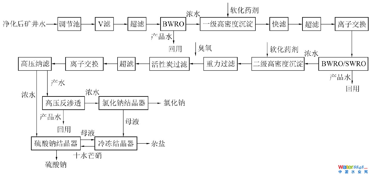 某地區(qū)外排礦井水要求滿足《地表水環(huán)境質(zhì)量標(biāo)準(zhǔn)》表1Ⅲ類和表2指標(biāo)要求,外排水含鹽量3 000 mg/L,其中SO42-860 mg/L、Cl-380 mg/L,設(shè)計(jì)規(guī)模30 000 m3/d。預(yù)處理段采用三級(jí)超濾、兩級(jí)高密藥劑軟化、兩級(jí)離子交換及臭氧分步協(xié)同預(yù)處理工藝,膜濃縮段采用BWRO+BWRO/SWRO+HPNF/HPRO工藝,蒸發(fā)結(jié)晶段采用膜法分鹽結(jié)晶工藝,工藝流程見圖3。最終產(chǎn)品水滿足《地表水環(huán)境質(zhì)量標(biāo)準(zhǔn)》Ⅲ類,TDS≤1 000 mg/L,SO42-≤250 mg/L,Cl-≤250 mg/L,硫酸鈉符合GB/T6009—2014工業(yè)硫酸鈉Ⅱ類一等品,氯化鈉符合GB/T 5462—2016精制工業(yè)鹽二級(jí)指標(biāo),項(xiàng)目投資3.8億,日噸水投資1.26萬元,水處理直接運(yùn)行成本8.2元/噸水,綜合運(yùn)行成本10.3元/噸水,系統(tǒng)綜合水回收率97%。