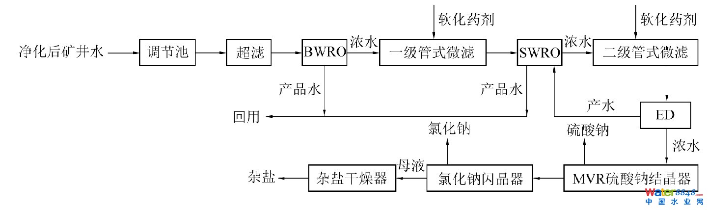 某礦應(yīng)地方環(huán)保部門要求,外排水含鹽量不超過1 600 mg/L,硫酸鹽不超過650 mg/L,實(shí)際水中含鹽量4 500 mg/L,硫酸鹽2 500 mg/L,設(shè)計(jì)規(guī)模590 m3/h。預(yù)處理段采用超濾、兩級(jí)藥劑軟化及管式微濾分步協(xié)同預(yù)處理工藝,膜濃縮段采用BWRO+SWRO+ED工藝,蒸發(fā)結(jié)晶段采用MVR熱法結(jié)晶分鹽工藝,工藝流程見圖2。最終產(chǎn)品水滿足中水再生利用標(biāo)準(zhǔn),TDS≤1 000 mg/L,SO42-≤250 mg/L,Cl-≤250 mg/L,硫酸鈉符合GB/T6009—2014工業(yè)硫酸鈉Ⅱ類一等品,氯化鈉符合GB/T 5462—2016精制工業(yè)鹽二級(jí)指標(biāo),項(xiàng)目投資1.4億,日噸水投資1.08萬元,水處理直接運(yùn)行成本6.4元/噸水,綜合運(yùn)行成本8.14元/噸水,系統(tǒng)綜合水回收率97%。