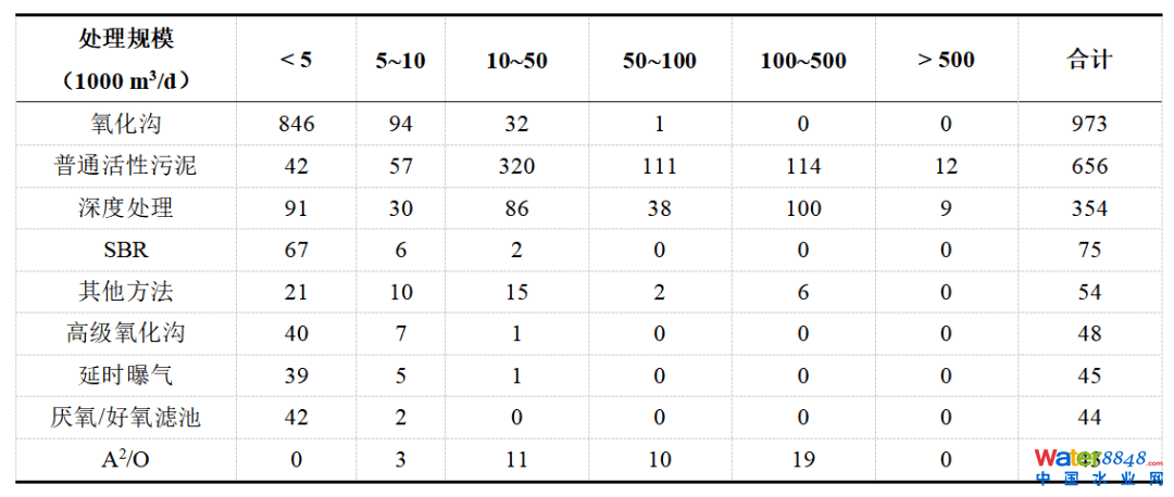 表1 不同處理規(guī)模下的處理工藝分類(lèi)