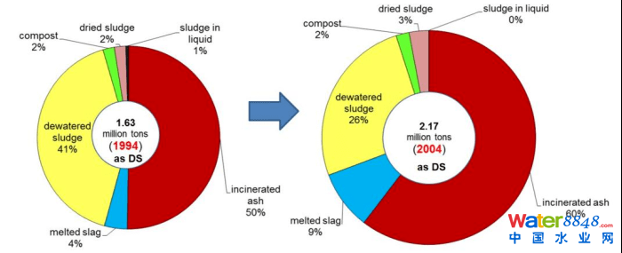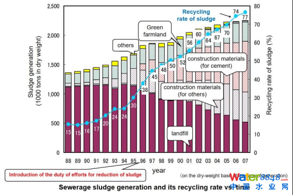 此外,隨著1996年污水處理相關(guān)法律的修訂,引入了“污泥減量義務(wù)”,污泥填埋比例不斷降低,至2007年降為約23%(圖6)。污泥資源化率則逐漸提高,總回收率為77%,回收的污泥中約80%被用于制造建材。