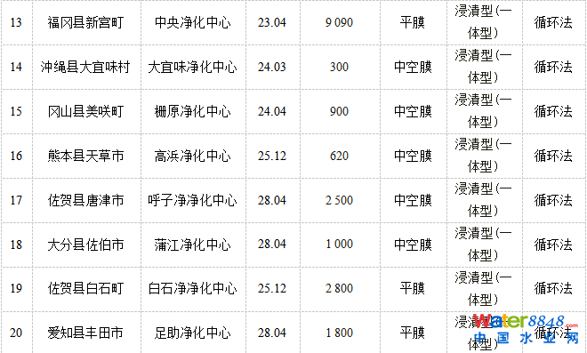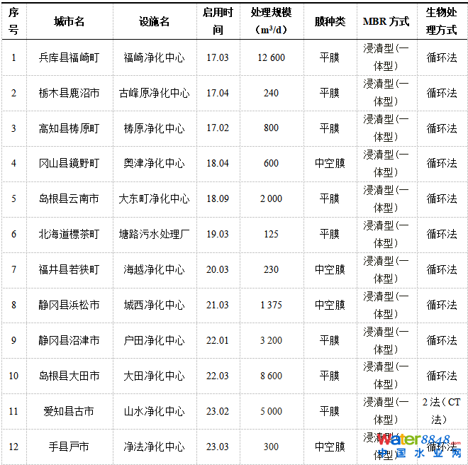 日本目前共有2145座市政污水處理廠,應(yīng)用數(shù)量前三的工藝分別是氧化溝、普通活性污泥法和深度處理(圖1c)。其中,傳統(tǒng)氧化溝工藝數(shù)量占比最大(973座,42.0%),廣泛應(yīng)用于≤1萬(wàn)m3/d污水處理廠。其次,普通活性污泥法數(shù)量為656座(占比28.3%),多應(yīng)用于1~50萬(wàn)m3/d的水處理廠。然而,國(guó)人十分熟悉的A2/O工藝在日本僅有43座(占比1.9%),其應(yīng)用數(shù)量還不及SBR工藝(75座)。盡管日本采用高級(jí)/深度處理工藝的污水處理廠數(shù)量為354座,占比14.2%,但是,采用MBR工藝的污水處理廠數(shù)量卻少得可憐,僅有24座,處理水量多為僅為幾百至上千m3/d小規(guī)模設(shè)施,最大一座也不過(guò)4萬(wàn)m3/d。