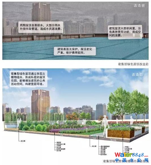 雨洪來臨時(shí),建筑屋頂產(chǎn)生的徑流是導(dǎo)致城市內(nèi)澇的重要原因之一。因此,將城市的建筑屋頂改造為綠色屋頂能有效緩解城市雨水徑流壓力。一方面,通過海綿城市結(jié)構(gòu)來收集、儲(chǔ)存雨水,并利用雨水進(jìn)行澆灌,可以節(jié)省各種能耗;另一方面,綠色屋頂將形成良好的城市景觀,提升城市的整體綠化率。