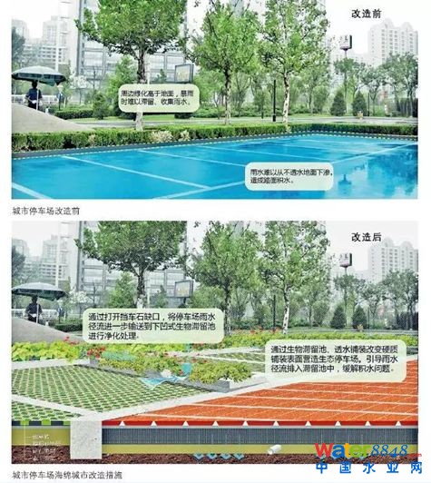 傳統(tǒng)住宅區(qū)中的停車場(chǎng)可以改造成透水植草磚生物滯留帶,用來收集周圍雨水。