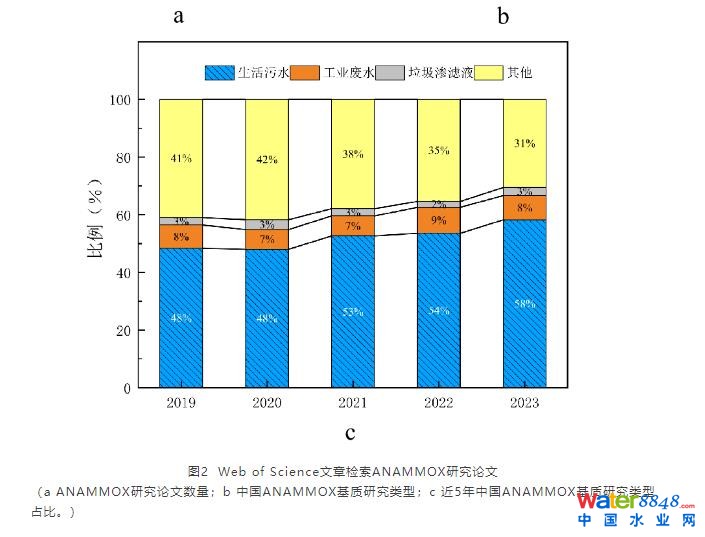 如果以進(jìn)水基質(zhì)類型分類,國內(nèi)以生活污水為基質(zhì)的論文1 903篇(61%),遠(yuǎn)高于工業(yè)廢水和滲濾液(12%)(圖2b)。進(jìn)一步追蹤近5年ANAMMOX基質(zhì)研究類型占比變化,國內(nèi)以生活污水為基質(zhì)的論文從2019年的150篇(48%)逐年上升至2023年的262篇(58%)。這說明目前我國對ANAMMOX的研究確實(shí)已不滿足止步于高氨氮濃度廢水,有將其拓展為大眾技術(shù)的企圖。