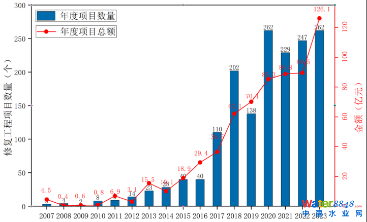 通過中國采購與招標(biāo)網(wǎng)、中國采招網(wǎng)等公開途徑不完全統(tǒng)計(jì),2023年土壤修復(fù)行業(yè)工業(yè)污染場(chǎng)地修復(fù)工程,資金額約126.1億元,項(xiàng)目數(shù)262個(gè)(見圖1),但2023年的土壤污染防治資金和水污染防治資金分別為30.8億元和170億元,相比2022年的44億元和180億元有所下降。