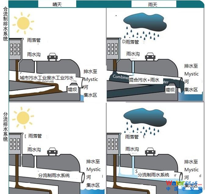 不同的排水系統(tǒng)(雨污)系統(tǒng)具有不同的結(jié)構(gòu),雖然現(xiàn)代排水系統(tǒng)已經(jīng)在一些地方用獨(dú)立的管道分離了雨水、生活污水和工業(yè)廢水,但像美國(guó)波士頓的一些舊排水系統(tǒng)仍然是合流制,排水管同時(shí)收集雨水及污水。在晴天的條件下,排水管里的污水全部被輸送至污水處理廠;在強(qiáng)降雨的條件下,污水與雨水在排水管里混合,流量有時(shí)會(huì)翻倍甚至三倍,此時(shí)舊的合流制排水系統(tǒng)就會(huì)過(guò)載,管內(nèi)的溢流污水(稱(chēng)為合流制溢流污水或“CSOs”)需通過(guò)溢流口(檢查井)排放到就近水體中。這雖然有效地阻止了污水倒流至房屋和街道上,但是排放到水體中的污水嚴(yán)重地影響了河流水質(zhì)。