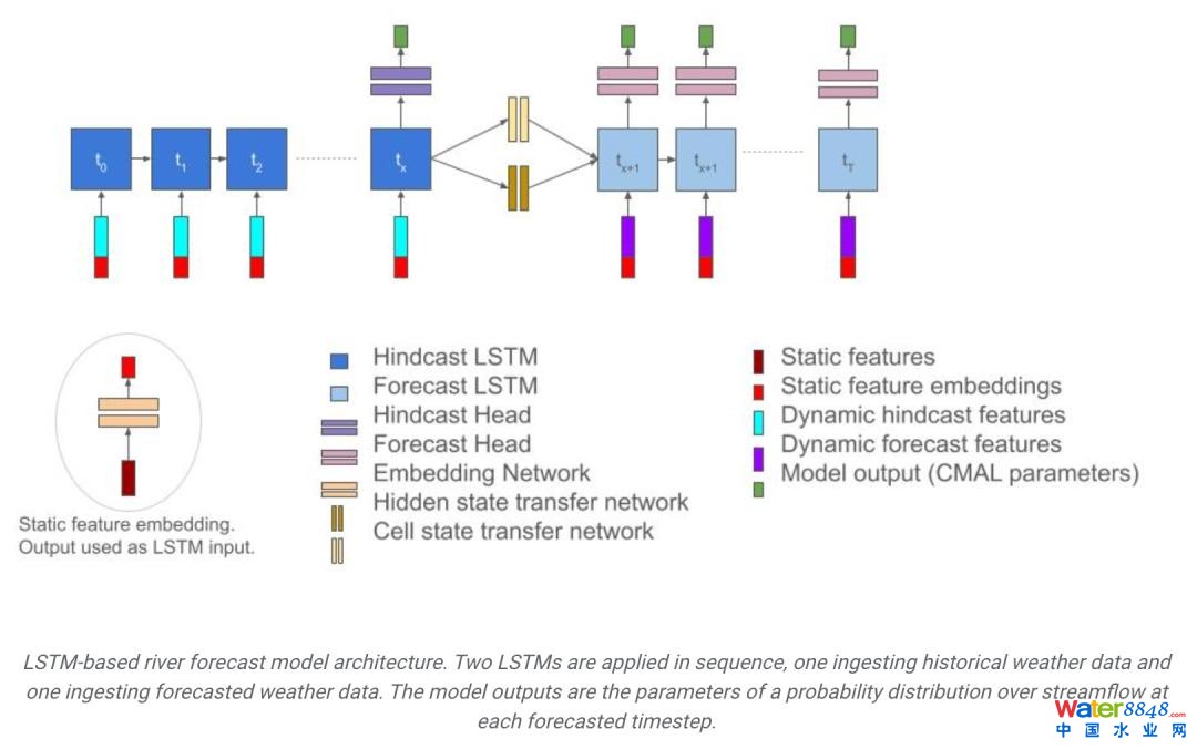 圖|基于 LSTM 的河流預(yù)報(bào)模型架構(gòu)。兩個(gè) LSTM 依次應(yīng)用,一個(gè)接收歷史天氣數(shù)據(jù),另一個(gè)接收預(yù)測(cè)天氣數(shù)據(jù)。模型輸出為每個(gè)預(yù)報(bào)時(shí)間步的流量概率分布參數(shù)。