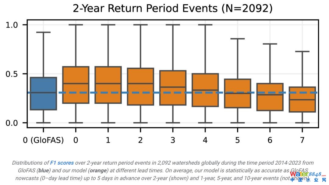 隨后,他們將該人工智能模型與全球領(lǐng)先的短期和長(zhǎng)期洪水預(yù)測(cè)軟件——全球洪水預(yù)警系統(tǒng)(GloFAS)進(jìn)行了對(duì)比測(cè)試。結(jié)果顯示,該模型同日預(yù)測(cè)準(zhǔn)確率與當(dāng)前系統(tǒng)相當(dāng)甚至更高。