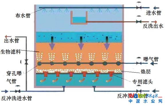 曝氣生物濾池是一種將生物氧化機(jī)理與深床過(guò)濾機(jī)理有機(jī)結(jié)合的新型污水生物處理技術(shù)。 (1)原理:以濾池中填裝的粒狀填料(如陶粒、焦炭、石英砂、活性炭等)為載體,在濾池內(nèi)部進(jìn)行曝氣,使濾料表面生長(zhǎng)著大量生物膜,當(dāng)污水流經(jīng)時(shí),利用濾料上所附生物膜中高濃度的活性微生物強(qiáng)氧化分解作用以及濾料粒徑較小的特點(diǎn),充分發(fā)揮微生物的生物代謝、生物絮凝、生物膜和填料的物理吸附和截留以及反應(yīng)器內(nèi)沿水流方向食物鏈的分級(jí)捕食作用,實(shí)現(xiàn)污染物的高效清除,同時(shí)利用反應(yīng)器內(nèi)好氧、缺氧區(qū)域的存在,實(shí)現(xiàn)脫氮除磷的功能。 (2)應(yīng)用范圍:曝氣生物濾池的應(yīng)用范圍較為廣泛,其在污水深度處理、中水回用、微污染源水處理、難降解有機(jī)物處理、低溫污水的硝化、低溫微污染水處理中都有很好的、甚至不可替代的功能。