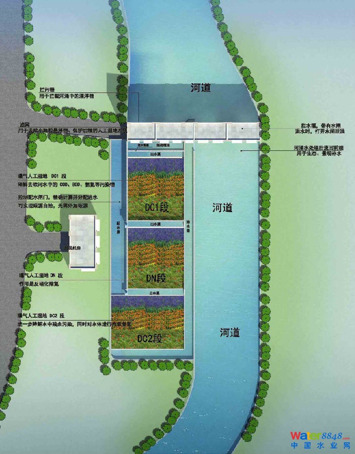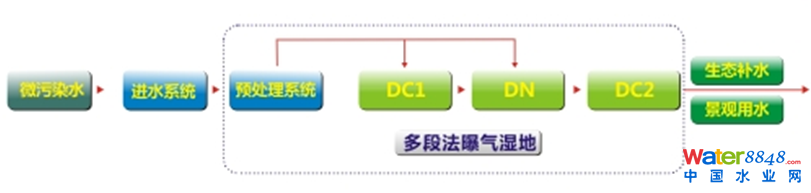 黑臭水體治理與生態(tài)修復(fù)消除城市河道、湖塘黑臭水體、改善城市水環(huán)境質(zhì)量,對(duì)保障城市人居健康、促進(jìn)社會(huì)和諧與經(jīng)濟(jì)持續(xù)發(fā)展具有極其重要的現(xiàn)實(shí)意義。 黑臭水體”黑“與”臭“的來(lái)歷:水溫適宜、水流緩慢和營(yíng)養(yǎng)鹽豐富是城市河道、湖塘的顯著特點(diǎn)。而黑臭水體則是過(guò)量納污導(dǎo)致水體生態(tài)失衡、缺氧環(huán)境下的生化結(jié)果,水體缺氧乃至厭氧條件下污染物轉(zhuǎn)化并產(chǎn)生氨氮、硫化氫、揮發(fā)性有機(jī)酸等惡臭物質(zhì)以及鐵、錳、硫化物等黑色物質(zhì)。生活污水是導(dǎo)致城市河道黑臭的最普遍和最主要的污染源。其他污染源還有:生活垃圾、工業(yè)廢水、混排管網(wǎng)溢流污水、污水廠尾水、降雨和冰雪融水、畜禽養(yǎng)殖場(chǎng)糞便污水、植物和藻類的腐敗物等。 黑臭水體消除技術(shù):多段法曝氣濕地 新型多段法曝氣濕地工藝流程圖 黑臭水體經(jīng)過(guò)預(yù)處理系統(tǒng)(格柵、濾網(wǎng)等),水中的大塊的漂浮物、垃圾袋被格柵攔截去除,細(xì)小的懸浮物被濾網(wǎng)攔截去除。經(jīng)過(guò)預(yù)處理后,黑臭水體先進(jìn)入曝氣濕地中的DC1段,去除污水中的COD、BOD、氨氮等污染物;再進(jìn)入DN段進(jìn)行反硝化脫氮,根據(jù)水質(zhì)情況,通過(guò)配水渠精確分配進(jìn)水水量,可以實(shí)現(xiàn)碳源自給,無(wú)需外加碳源;之后進(jìn)入DC2段曝氣復(fù)氧,最后留回前端,作為生態(tài)補(bǔ)水及景觀用水。 黑臭水體經(jīng)過(guò)新型多段法曝氣濕地處理后效果圖: 黑臭水體治理效果圖 |