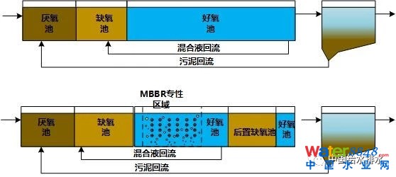技術路線II,Bardenpho-MBBR+高效沉淀池+反硝化深床濾池。