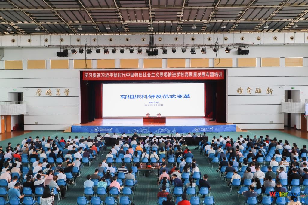 為深入學(xué)習(xí)貫徹習(xí)近平新時代中國特色社會主義思想和黨的二十大精神,切實推動學(xué)校加快發(fā)展高質(zhì)量發(fā)展,5月26日上午,學(xué)校在屏風(fēng)校區(qū)體育館三樓舉辦“學(xué)習(xí)貫徹習(xí)近平新時代中國特色社會主義思想 推進(jìn)學(xué)校高質(zhì)量發(fā)展”專題培訓(xùn)。我校名譽(yù)校長、中國工程院院士、發(fā)展中國家科學(xué)院院士、美國國家工程院外籍院士曲久輝受邀到場作專題報告。在家校領(lǐng)導(dǎo)鄧軍、王敦球、吳志強(qiáng)、周國清、韋學(xué)敏、曾繁榮,黨委常委唐壯東、葉昊、邱杰,黨委委員、校長助理辛立章等出席報告會。會議由學(xué)校校長王敦球主持。學(xué)校處級、科級干部,教研室及實驗室主任、副主任到場聆聽。