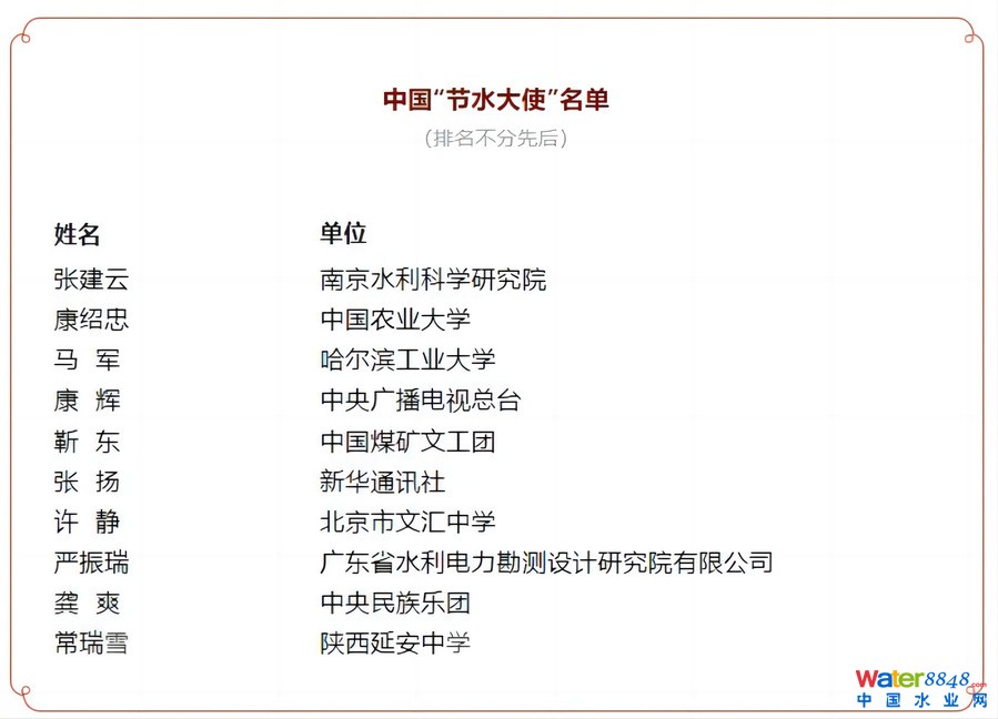 據(jù)了解,中國“節(jié)水大使”選聘工作由水利部、全國人大環(huán)境與資源保護(hù)委員會、全國政協(xié)人口資源環(huán)境委員會、教育部聯(lián)合開展,旨在深入推進(jìn)國家節(jié)水行動(dòng),加強(qiáng)節(jié)水宣傳教育,提升全民節(jié)水意識。經(jīng)過調(diào)查評估、征詢本人和所在單位意見、會議綜合評議、社會公示等環(huán)節(jié),共遴選出10名來自不同領(lǐng)域、具有較高知名度影響力且熱心公益事業(yè)、社會形象良好的中國“節(jié)水大使”。