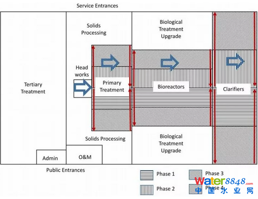 WRRF的廠房布局和工藝反應(yīng)池的設(shè)計(jì)不應(yīng)該僅限于現(xiàn)在的處理要求和技術(shù),而是應(yīng)該具有應(yīng)對未來政策要求和技術(shù)的包容性。這在技術(shù)上實(shí)可行的。用Buildingblock的思維來設(shè)計(jì)布局是一個(gè)可行的方法來面對處理能力、處理要求和有機(jī)物處理升級(jí)的變化,還有就是在美學(xué)和環(huán)境上的考慮。只有能幫助污水廠應(yīng)對變化的設(shè)計(jì)規(guī)劃,才是通往未來水資源回收廠的正道。