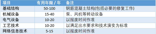 通過下表可以看出,鋼筋混凝土結(jié)構(gòu)和管網(wǎng)渠道等的壽命是可以很長的,像泵、風(fēng)機(jī)等轉(zhuǎn)動(dòng)設(shè)備次之,所以設(shè)計(jì)布局的重要一點(diǎn)是要提供更具適應(yīng)力的工藝反應(yīng)池來應(yīng)對不同的目的和處理技術(shù)。
