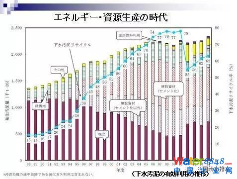 圖中紫紅色表示污泥填埋處理量。藍色圓圈表示污泥量得到有效利用的百分比。黑色塊表示污泥轉化為能源的比例。日本1988年產(chǎn)生的污泥量為150萬噸左右,用于農(nóng)地和其他肥料的只占15%,大部分都是填埋處理。隨著下水道處理率的普及和提高,污泥產(chǎn)量也逐漸上升,填埋的污泥逐漸地減少。2010年污泥的有效利用率達到了78%。主要是將污泥進行焚燒,污泥灰用作水泥生產(chǎn)的原料。2011年由于日本福島發(fā)生了大地震,原來建在海岸邊上的很多污泥處理設施遭到了破壞,導致污泥利用率由78%驟降至55%。最近這幾年又逐漸恢復。