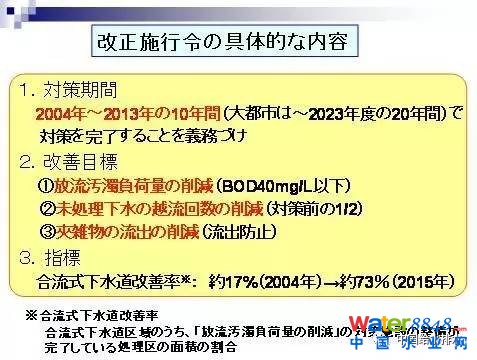 接下來就前述調查報告內容進行具體介紹。合流制下水道出現(xiàn)這樣的問題,對于從事下水道工作的人來說,心里都清楚。如果被人家指責的話,相關的下水道人都會感到很害怕。如果要改善的話,要花費大量的人力和經(jīng)費。很多合流制下水道的管理者也很害怕把這個問題表面化。而且,地方政府也不積極地配合,因此政府的直營調查當時遇到了很大的困難。需要由國家的交通省直接來進行調查。日本政府為合流制的改善,制定了三個新的政策。首先是改善溢流口的結構,把溢流水面提高一些。第二個是盡量增加一些格柵,把垃圾擋在里面。還有在下雨的時候,對流出來的BOD總量進行整體的規(guī)定,不能超標。第三是對每個城市改善合流制下水道的期限做明確的規(guī)定。處理區(qū)在1500公頃以下的區(qū)域要求在2023年之前全部解決完畢,2023年大城市全部都要處理完畢。因為大的城市積重難返,問題比較多,因此需要更多的時間,需要到2023年才能改善合流制的問題。