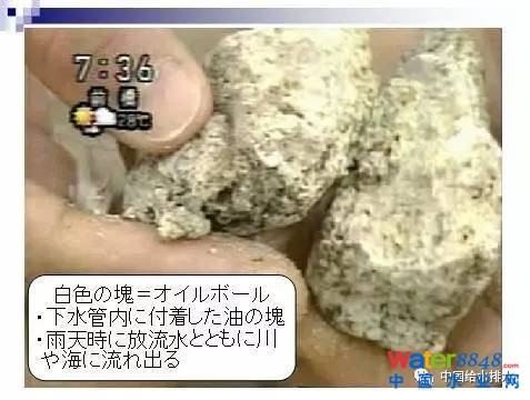 2000年左右,東京的臺廠海濱公園,在海岸的岸邊上發(fā)現(xiàn)了很多白色硬塊,在社會上引起了很大的反響。經(jīng)過調查和分析,發(fā)現(xiàn)這個硬塊原來是黏附在排水管道里面的油脂硬塊所造成的,是公共管網(wǎng)里面排放出來的污染物。