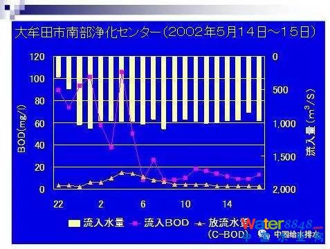 同樣,大坂市也采用雨天時活性污泥法對污水進行了處理。這是平時三倍左右的量。很明顯,污染物濃度有很大的提高,但是流出水水質沒有很大的變化。對處理水的狀況進行細分,懸浮物會有所上升,但是BOD和COD有明顯的變化。