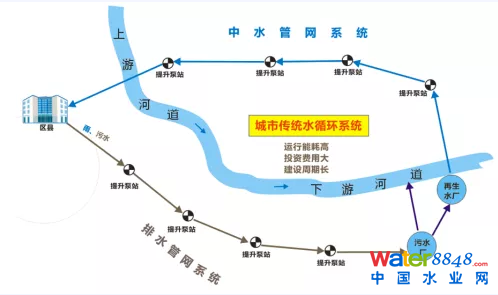 雖然很多污水處理廠有了美麗的外衣,但城市內河缺少生態(tài)補水的問題依然存在。隨著群眾對生活環(huán)境要求的提高,河長制的不斷深化推進,內河缺水問題凸顯,建立中水管網(wǎng)系統(tǒng)成為城市河道補水的重要工程。傳統(tǒng)方法是在集中污水處理廠出水端建立再生水廠并通過補水管道進行河道補水,但由于大部分集中污水處理廠位于城市中心下游30km的距離,遠距離輸送能耗高,而且回用管道鋪設成本高,在推行過程中難度很大(見圖1)。
