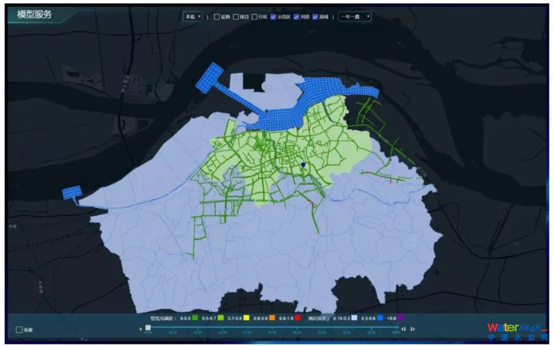 模型關(guān)聯(lián)耦合:根據(jù)匯水區(qū)和管網(wǎng)系統(tǒng)構(gòu)建水文和水動力的耦合模型,再結(jié)合輸出的排口的污染物負(fù)荷與金山湖水質(zhì)穩(wěn)態(tài)質(zhì)量平衡分析法進(jìn)行耦合,通過金山湖水環(huán)境容量推出需要控制的污染負(fù)荷。