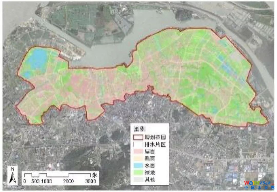 下墊面解析、旱季污水日變化及降雨雨型分別如下圖所示: