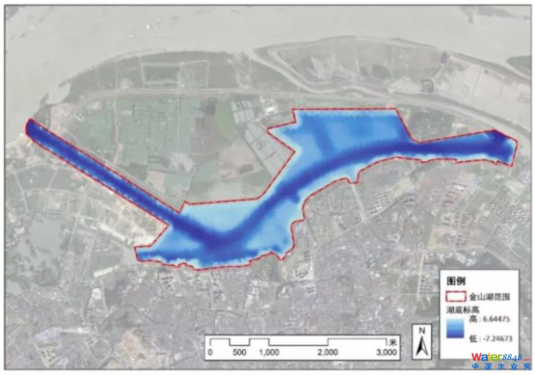 金山湖是由長江主泓道北移、南淤北蝕而形成的牛軛湖,也是城區(qū)運糧河、古運河和虹橋港的受納水體,常年水域面積為6.55km2,豐水期水域面積可達8.8km2。水位常年穩(wěn)定在3.8~4.2m,金山湖水質管理區(qū)及湖底高程分布如下: