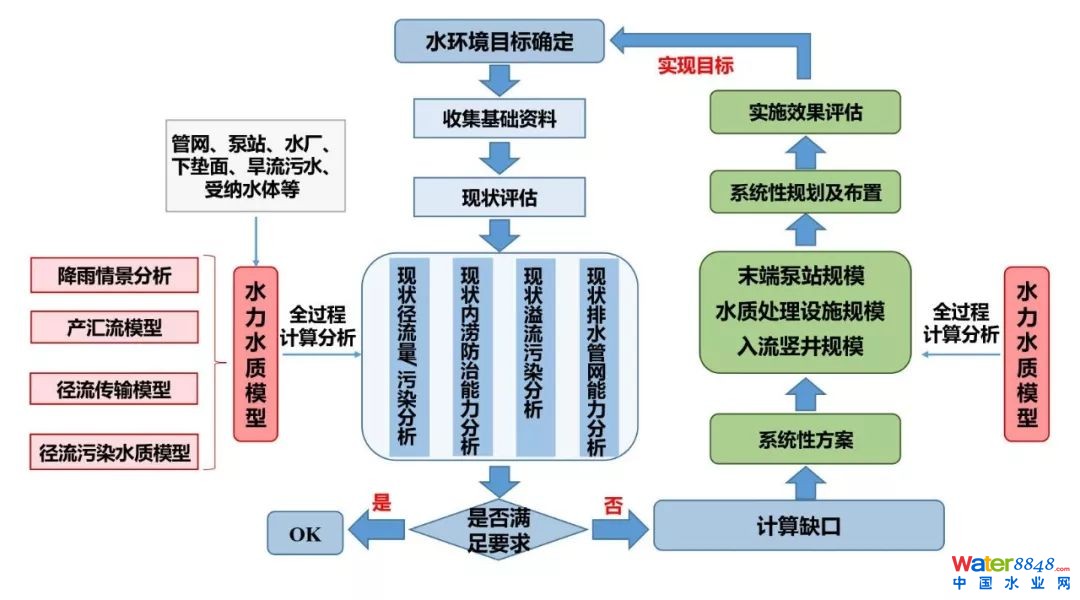 首先確定金山湖水環(huán)境目標,在基礎資料收集基礎上,構建管網模型及水力水質模型耦合進行現狀評估,包括現狀徑流總量/徑流污染分析、現狀排水防澇能力分析、現狀溢流污染分析和現狀排水管網能力分析,對比建設目標和現狀,對現狀存在缺口的,進行工程系統(tǒng)性方案規(guī)劃,進一步通過水力水質模型優(yōu)化工程建設規(guī)模和實施效果評估,最終確定工程建設方案。