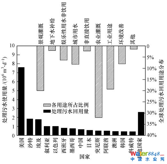圖 1 全球再生水回用量分布和用途分類(US EPA,2012)(部分?jǐn)?shù)據(jù)源自Jiménez et al., 2008)Fig. 1 The distribution of global water reuse and the classification of its uses |