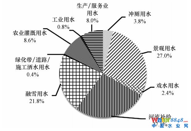 2009年日本公布的《下水道白皮書》明確了污水再生利用的重要性(張昱等,2011).據(jù)統(tǒng)計(jì)(國土交通省土地·水資源局水資源部,2013),2010年日本共有污水處理廠約2100座,年總處理量為147億m3,而再生水廠約有290座,再生水總產(chǎn)量為1.92億m3,約占總處理量的1.31%.目前日本的再生水主要用于沖廁、景觀、戲水、河流補(bǔ)給、融雪、綠化帶/道路/施工灑水、農(nóng)業(yè)灌溉、生產(chǎn)/服務(wù)業(yè)以及工業(yè)等(張昱等,2011; 國土交通省土地·水資源局水資源部,2013),各部分所占比例見圖 2.