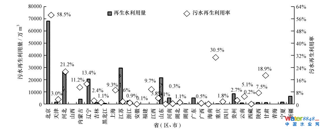 圖 3 2010年我國各省(區(qū)、市)城鎮(zhèn)污水處理再生利用量與利用率(中華人民共和國住房和城鄉(xiāng)建設(shè)部,2012)Fig. 3 Percentage and amount of water reuse in China in 2010 |