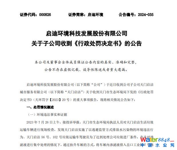 4月19日消息,啟迪環(huán)境科技發(fā)展股份有限公司公告,其子公司天門啟潔城市服務(wù)有限公司因環(huán)境違法行為被天門市生態(tài)環(huán)境局處以罰款20萬元。