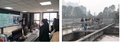 廠黨支部書記、廠長陳周華同志為參觀者講解污水處理流程、各構(gòu)筑物和設(shè)備的工作原理及運行狀況。