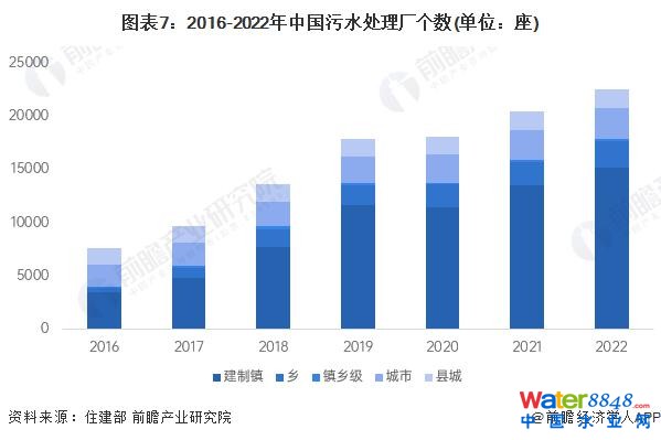據(jù)住建部統(tǒng)計數(shù)據(jù),2022 年,我國污水處理廠達到 22470 座,同比增長 10.12%; 其中,建制鎮(zhèn)共有污水處理廠約 1.52 萬座,城市、縣城分別有污水處理廠 2894 座、1801 座。