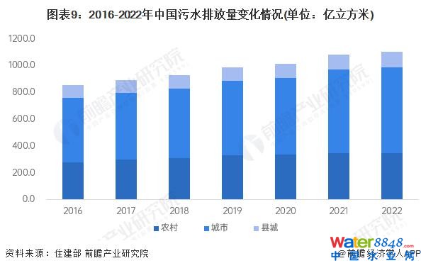 據(jù)住建部公布數(shù)據(jù)顯示,2016-2022 年,我國污水排放總量持續(xù)提升,2022 年,污水排放量達到 1099 億立方米,同比增長 1.7%,其中,城市、農村、縣城污水排放量分別為 639 億立方米、345.3 億立方米、114.9 億立方米。