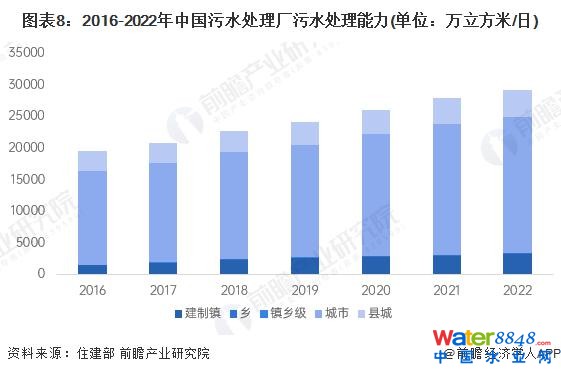 隨著國家政策不斷推動污水處理提質增效,我國污水處理廠處理能力大幅提高,其中,在鄉(xiāng)村振興戰(zhàn)略支持下,農村為增速最快的區(qū)域,據(jù)住建部統(tǒng)計數(shù)據(jù),2016-2022 年,建制鎮(zhèn)、鄉(xiāng)區(qū)域污水處理能力年復合增長率分別為 14.1%、33.3%,遠高于城市、縣城區(qū)域。