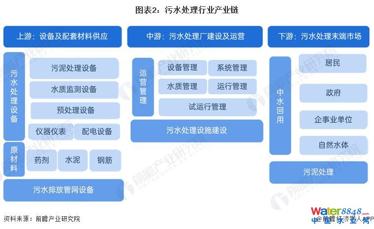 污水處理產業(yè)鏈上游主要包括各類污水處理設備及配套材料的供應,包括污水排放管網(wǎng)、污水處理藥劑、水質監(jiān)測設備以及污泥處理設備的生產制造 ; 中游主要是污水處理廠建設及運營管理,目前污水處理項目運營方式主要有 BOT、TOT、DBO 以及委托經營等 ; 下游主要是中水回用、污泥處理等污水處理末端市場。