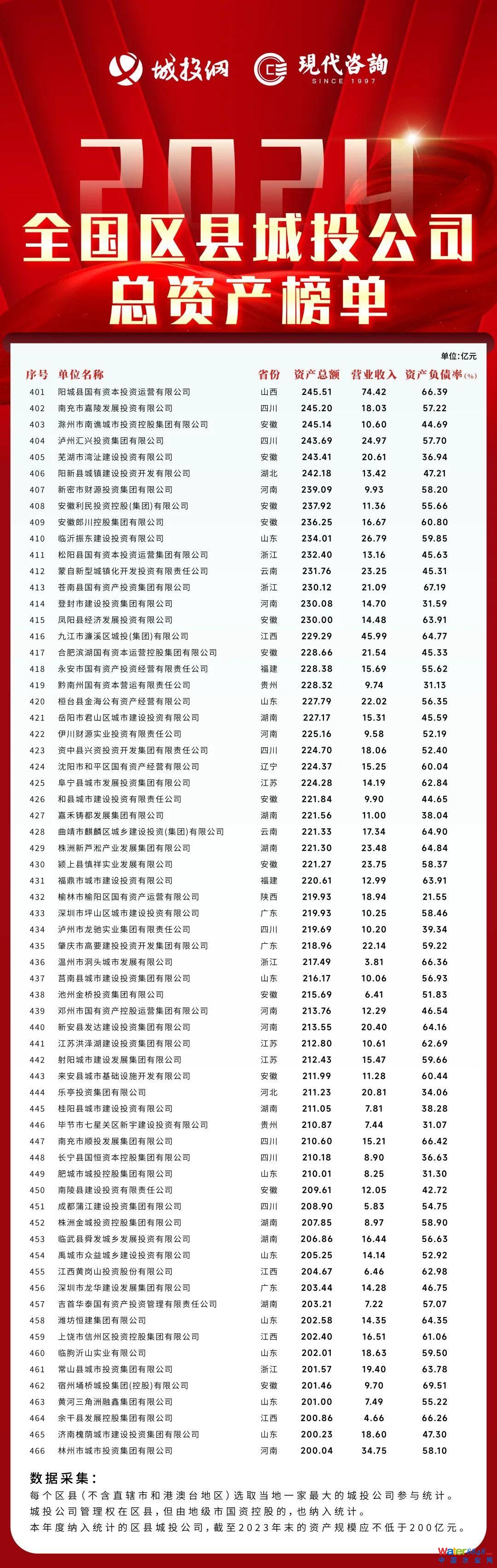 2024全國區(qū)縣城投公司總資產(chǎn)榜單(401-466)