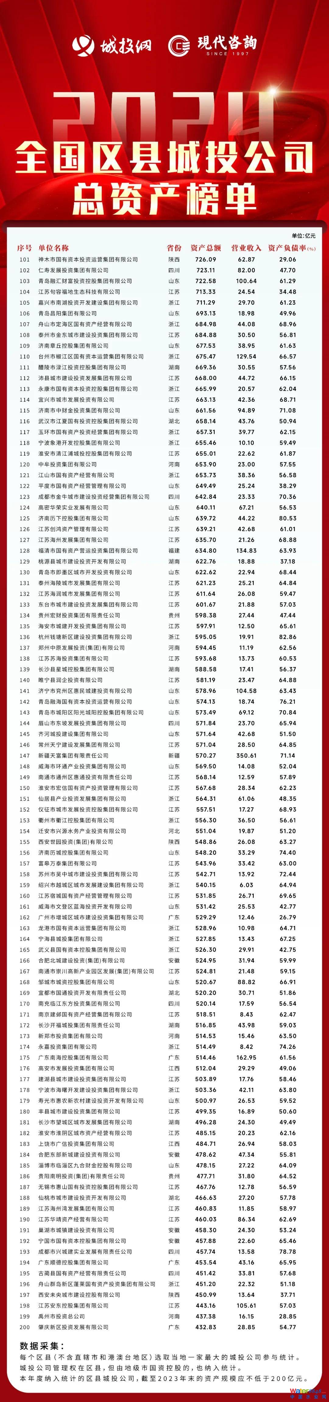 2024全國區(qū)縣城投公司總資產(chǎn)榜單(101-200)