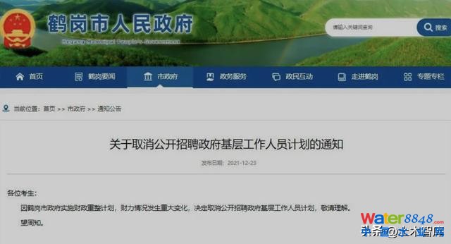 據(jù)鶴崗市人民政府網(wǎng)站,2021年12月23日,鶴崗市人力資源和社會(huì)保障局發(fā)布《關(guān)于取消公開招聘政府基層工作人員計(jì)劃的通知》,原因是,“因鶴崗市政府實(shí)施財(cái)政重整計(jì)劃,財(cái)力情況發(fā)生重大變化”,人員招聘工作無法正常開展了。