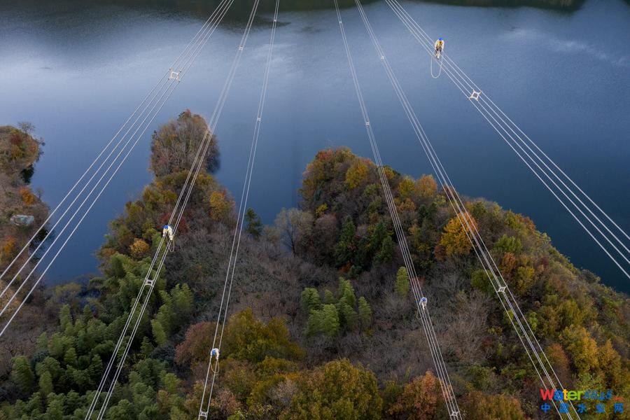 在六安市金寨縣山區(qū),工人在500千伏輸電導(dǎo)線上進(jìn)行檢修作業(yè)(資料照片)。新華社發(fā)(鄭賢列 攝)