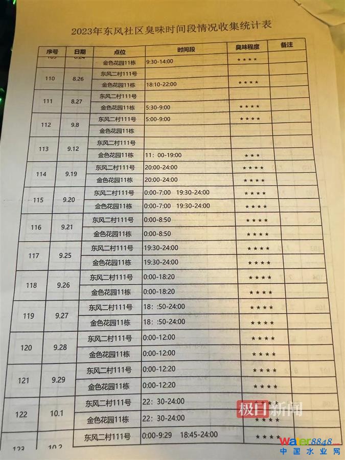 金色花苑小區(qū)和東風(fēng)二村111號(hào)的居民們用表格記錄了臭味的時(shí)間,極目新聞?dòng)浾叻喛吹,記錄臭味的時(shí)間段大多是在夜間。