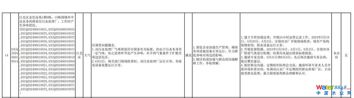 一覽表上顯示,經(jīng)調(diào)查問題屬實(shí)。該污水處理廠氣體排放符合國家有關(guān)標(biāo)準(zhǔn),但由于污水本身有一定氣味,加之處理環(huán)節(jié)也產(chǎn)生異味,在不利氣象條件下擴(kuò)散至周邊居民區(qū)。6月3日,相關(guān)部門現(xiàn)場檢查時(shí),污水處理廠運(yùn)行正常,各除臭設(shè)備裝置運(yùn)行正常。辦結(jié)目標(biāo):督促企業(yè)加強(qiáng)生產(chǎn)管理,確保各項(xiàng)設(shè)施設(shè)備正常運(yùn)行,盡力降低異味對周邊的影響。轄區(qū)街道加強(qiáng)與群眾的溝通解釋工作,爭取群眾理解。