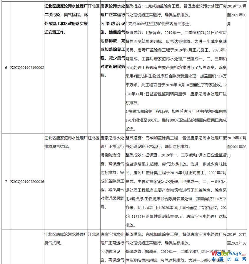2021年3月30日,重慶江北區(qū)政府官網(wǎng)公布的《第二輪環(huán)保督察群眾舉報(bào)投訴問題整改銷號(hào)第二批情況公示》顯示,針對群眾投訴的唐家沱污水處理廠臭氣擾民情況,整改成效為:唐污廠加蓋除臭工程于2019年5月正式施工,2020年7月建成,主要對唐家沱污水處理廠已建成一、二、三期和污泥處理工程現(xiàn)有主要產(chǎn)臭構(gòu)筑物進(jìn)行了加蓋除臭,除臭采用4套洗滌—生物濾床聯(lián)合除臭裝置處理,加蓋面積7.14萬平方米。此工程項(xiàng)目于2020年10月10日通過了專家驗(yàn)收。2020年11月5日監(jiān)督性監(jiān)測結(jié)果顯示,唐家沱污水處理廠達(dá)到了排放標(biāo)準(zhǔn)。按照加蓋除臭工程環(huán)評,加蓋后唐污廠衛(wèi)生防護(hù)距離由原270米縮短至100米,目前100米衛(wèi)生防護(hù)距離內(nèi)居民已完成搬遷。