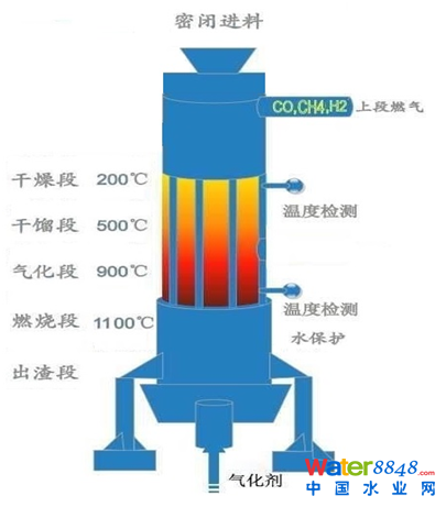 1.干燥:污泥進(jìn)入氣化爐,在下降的過程中與高溫?zé)峤馊細(xì)饨佑|,污泥中的水變成蒸汽和熱解燃?xì)庖黄鹋懦鰻t外,污泥逐步變干燥。