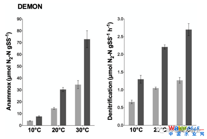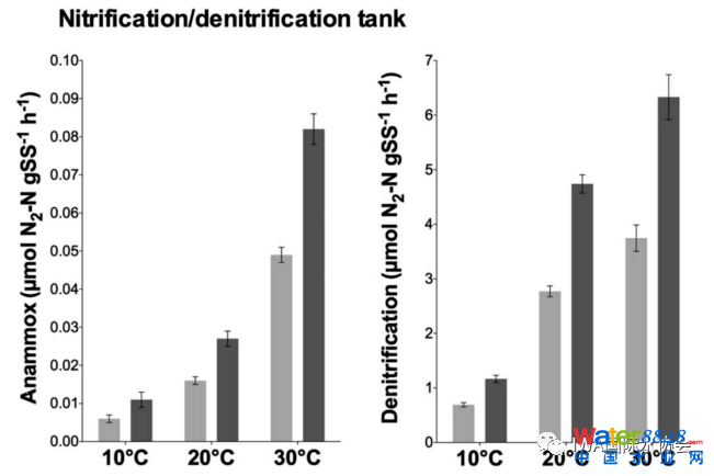 如下圖1所示,厭氧氨氧化和反硝化反應(yīng)顯示了溫度依賴性,在30°C時反應(yīng)速率最高,而且溫度對anammox菌影響更明顯—— 10°C的速率和30°C的速率相差近10倍